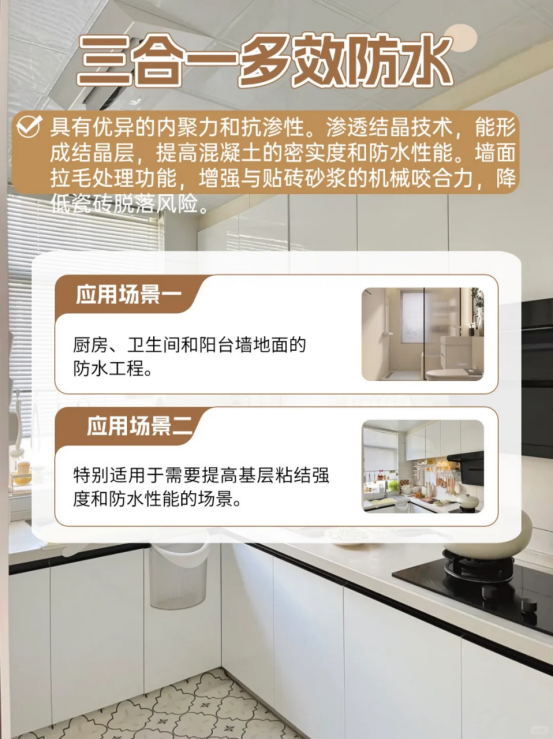 三合一多效防水产品,具有优异的内聚力和抗渗性。渗透结晶技术,能够形成结晶层,提高混凝土的密实度和防水性能。墙面拉毛处理功能,增强与贴砖砂浆的机械咬合力,降低瓷砖脱落风险。