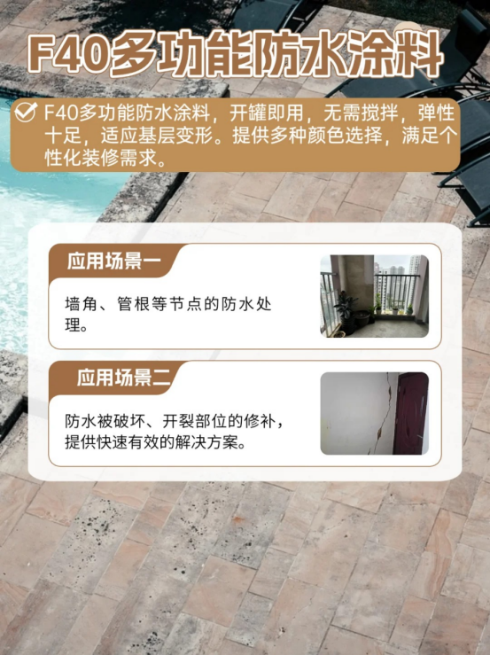 F40多功能防水涂料,开罐即用,无需搅拌,弹性十足,适应基层变形。提供多种颜色选择,满足个性化装修需求。